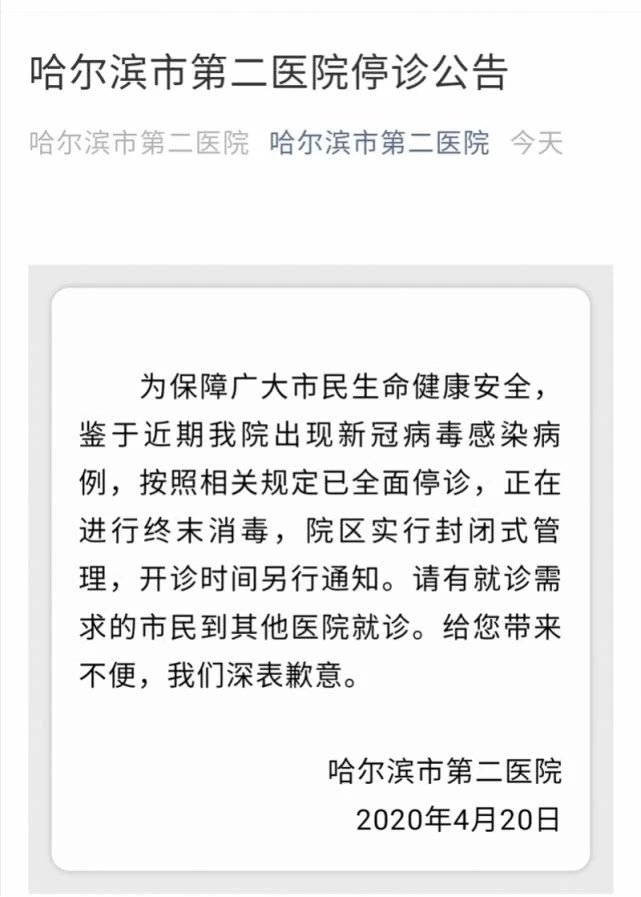 4月20日,哈尔滨市第二医院在其微信公众号发布停诊公告。