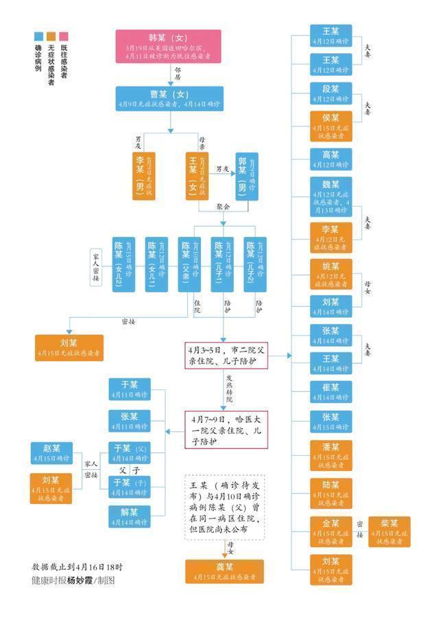 4月5日,由其父亲开车送至太平国际机场到上海做了一个手术,在上海待了3天,4月8号返回哈尔滨,回到父母家居住,跟她的父母还有弟弟一起居住,直至4月10号。在这个期间,4月9号我们有一个病例,就是曹某,当时是无症状感染者,后来4月14日转为确诊病例。对曹某的密切接触者进行筛查的时候,韩某作为密接人员进入了我们的视线,而且她有国外的尤其是美国、纽约这样的高疫区的旅居史,随即我们对她进行了核酸和抗体的检测,这个是在4月10号,结果是核酸阴性,IGG阳性,IGM阴性。随即我们下午就进行了再次深入的流调,4月10号的下午,我们又采了一次样,4月11日反馈的结果,依旧是核酸阴性,IGG阳性,IGM阴性。之后对韩某及其家人进行了集中隔离,现在依旧在宾馆进行集中隔离。