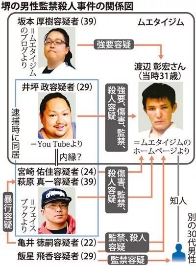 另外5名共犯分别是坂本厚树(39岁)、荻原真一(39岁)、饭星飞香(29岁)、宫崎佑佳(24岁)、龟井得嗣(21岁)。