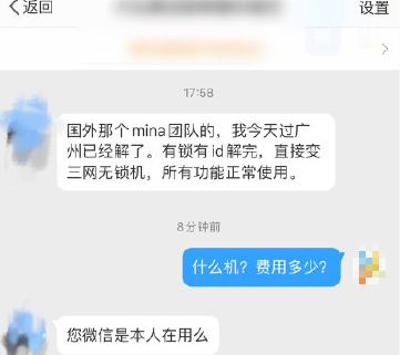 在今年9月份的时候,苹果封锁了黑解的激活方式,断了不少奸商的财路。万万没想到的是,利用这个可以越狱的漏洞,「黑解」iPhone居然又再次死灰复燃了。根据网友曝光,一个名为「Mina」的团队,以此为突破口绕过了苹果官方的ID锁,从而实现变相的「黑解」,并且收取一次性几百块钱的费用。