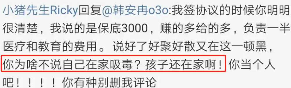 因为有些行为是不能被原谅的,无论是谁触犯了这条底线都不可能被原谅。小猪先生曝出这件事情也只不过是被迫反击,因为韩安冉在自己的评论区吐槽小猪先生给恩善的抚养费比较少!