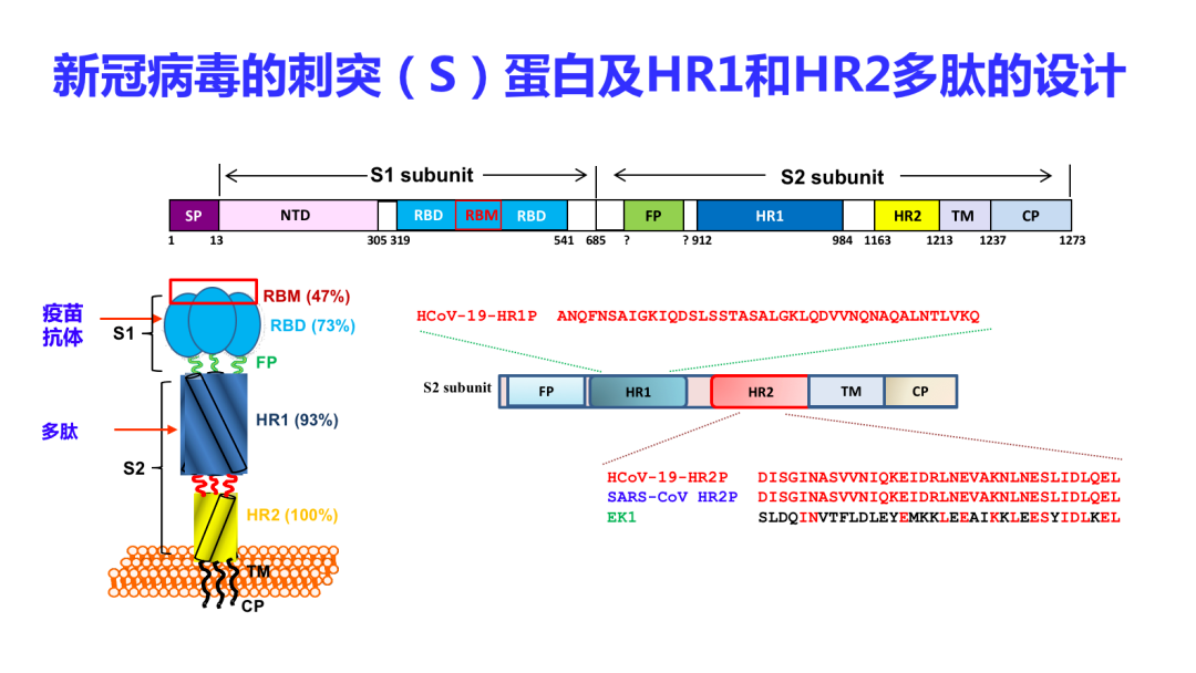我们很快把新冠病毒S蛋白序列分析出来了,找到它的HR1和HR2区,设计了衍生于新冠病毒HR2区的多肽,实际上,这个多肽和SARS冠状病毒S蛋白的HR2区的氨基酸序列是完全一样的。