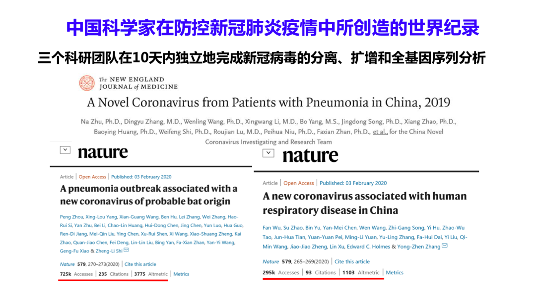 比较一下2003年在广东地区爆发的非典疫情,当时中国大陆几乎没有人知道它的病原体。直到三个多月后才有香港、美国、德国科学家发现其病原体和SARS冠状病毒,文章先后发布在Lancet等医学杂志。当时Science说“China missed chance”中国失去了机会,世界上早在2月26号,军科院的杨瑞馥和朱庆余两位老师已经在电子显微镜下看到冠状病毒的图形,但由于当时有权威认为是支原体,所以没有发表。还有武汉病毒所肖庚富研究员的团队,在20天内发现可用于治疗新冠肺炎的药物比如瑞德西韦、氯喹,他们文章发表在Cell Research,在短短的两个月之内已经被98万人次点击,引用107次,现在这两个药已经在临床使用或在临床观察当中。这也是一个奇迹。