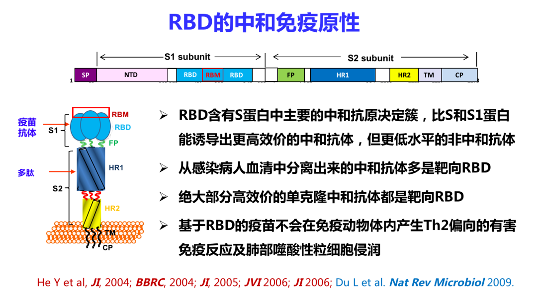 在15年前,我们团队发表了一系列的文章证明RBD含有S蛋白中主要的中和抗原决定簇,比S蛋白和S1蛋白能诱导出更高效的综合抗体,但更低水平的非中和抗体。从感染病人血清中分离出来的中和抗体绝大部分是靶向RBD的。绝大部分的高效价的单克隆中和抗体都是靶向RBD。基于RBD疫苗不会在免疫动物体内产生Th2偏向的有害免疫反应及肺嗜酸性细胞浸润。从这方面来看,RBD应该是一个最安全、最有效的疫苗抗原。