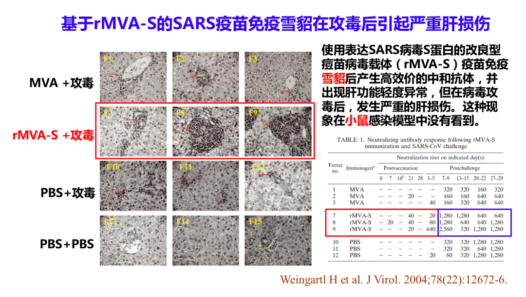 在2004年加拿大P4实验室的Cao Jingxin主任使用能表达全长S蛋白的改良痘苗病毒载体做的疫苗来免疫雪貂,免疫后发现可以产生很高效的综合抗体。但是在用活病毒攻毒以后,雪貂肝脏的转氨酶增加,肝脏造成了损伤。所以他们认为用S蛋白作的病毒载体疫苗免疫雪貂在攻毒之后也可以造成严重的肝损伤。所以,我们做疫苗的动物试验时,不光是用小鼠或猴子感染模型,最好也用雪貂感染模型,因为它更加敏感。有时候我们看不到疫苗免疫造成的病理损伤,也可能是使用的动物模型不够代表性。