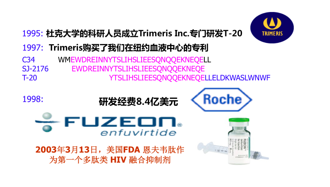 1995年杜克大学的研究人员成立了Trimeris公司,专门研发T20,但是因为他们的多肽和我们的多肽有70%以上的序列是完全一样的,所以他们必须买断我们的专利。后来1998年罗氏出资8.4亿美元,把这个多肽推向临床,2003年恩夫韦肽被美国FDA批准,成为第一个多肽类的HIV融合抑制剂。