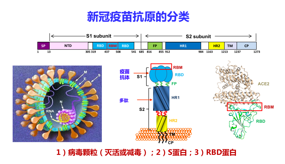 刚才谈到新冠疫苗有很多类型,比如灭活疫苗、载体疫苗、核酸疫苗、亚单位疫苗,根据疫苗抗原主要分为三类:一是病毒颗粒,包括灭活和减毒疫苗;二是S蛋白疫苗,包括全长S蛋白;三是受体结合域(RBD)疫苗。全长S蛋白在酶解之后分为两个亚单位,S1亚单位含有NTD、RBD两个重要功能区域。
