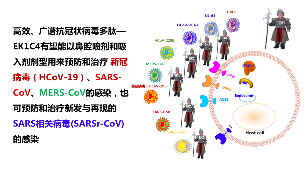 这些工作证明,EK1C4脂多肽是高效广谱的抗冠状病毒多肽,将来有望能以鼻腔喷雾或者吸入剂的形式预防和治疗新冠病毒、SARS-CoV、MERS-CoV感染,也可以预防和治疗将来新发与再现的SARS相关病毒(SARSr-CoV)的感染,这是非常广谱的。