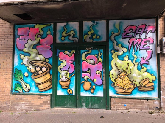 在Chan的中餐厅因故意破坏而不得不钉上木板后,当地艺术家用明亮美丽的壁画覆盖了木头。