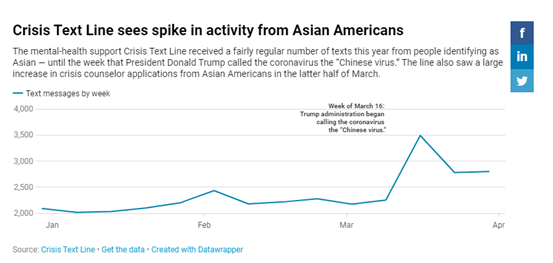 此外,据非营利组织Crisis Text Line(是一种通过短信提供免费心理健康咨询的非营利组织),统计,在今年1月的第一周到3月的最后一周之间,来自亚洲人的短信增加了39%。在此期间,求助量最多的时候发生在争议病毒起源的那一周。
