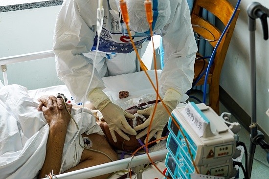3月24日,70岁的鲁江躺在武汉同济医院中法新城院区9楼ICU的病床上,上身裸露,握成拳的双手放在胸口,胸部的起伏越来越大,呼吸越来越急促。眼神中有一丝不安,不断张望身旁的医护。