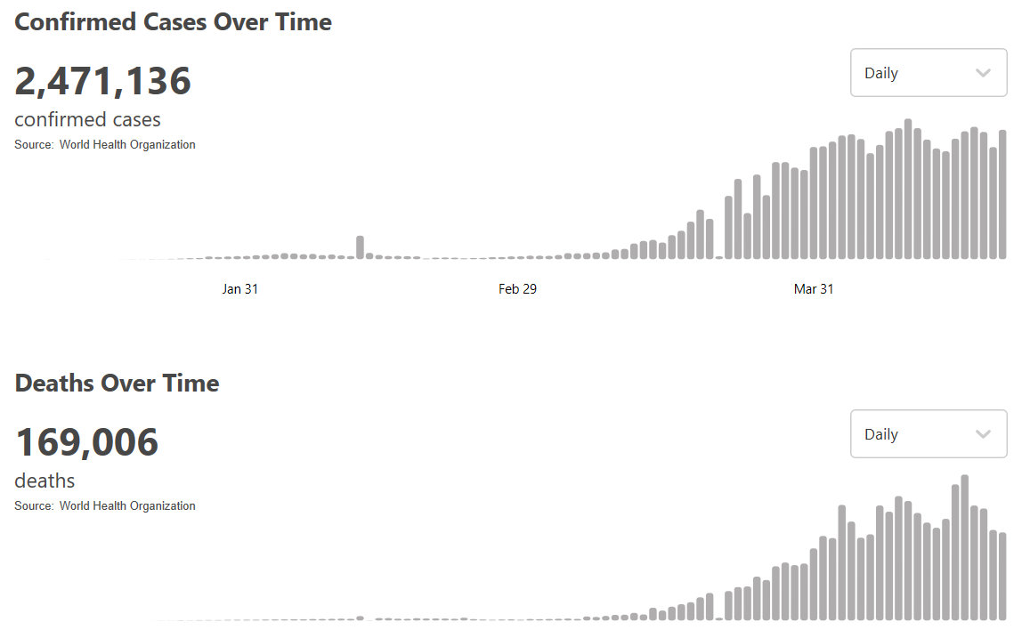 根据世卫组织最新实时统计数据,目前全球确诊新冠肺炎2471136例,死亡169006例,中国以外超过238万例。