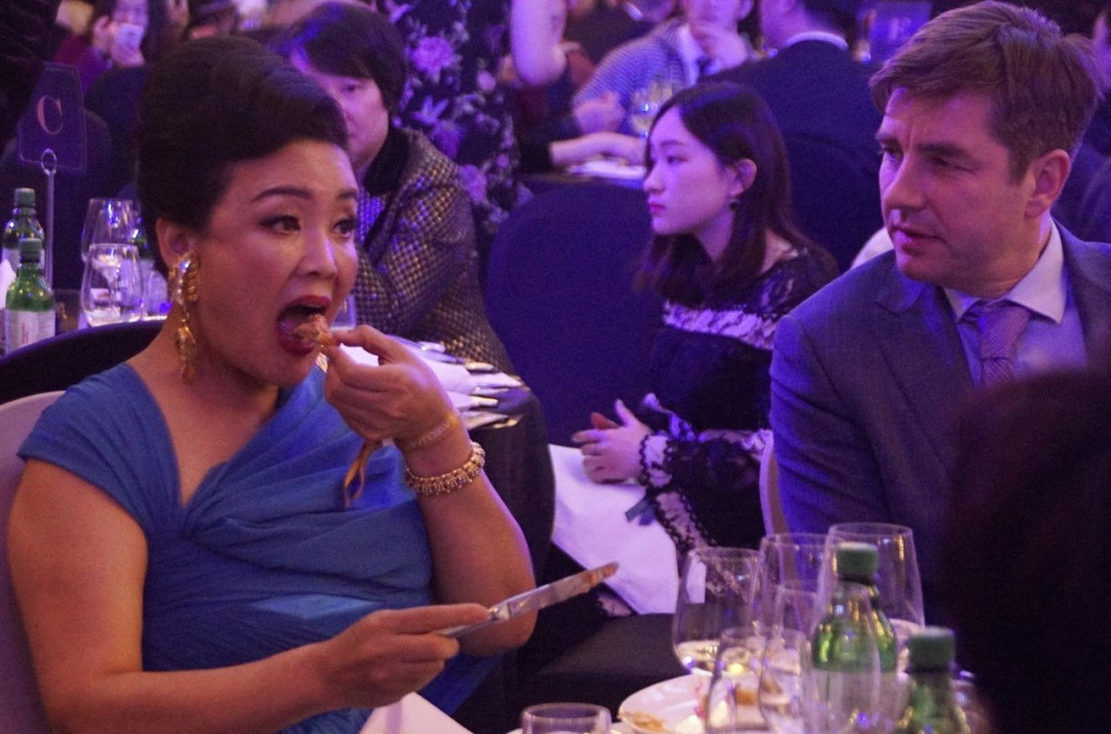 这件礼裙的下摆是缎面面料的,而且是百褶裙的款式,这种设计增加了裙装的灵动气息,展现出“液体裙”的特点,看起来很有吸引力,由于光感的变化,蓝色的深浅感觉也是不一样的,所以穿搭显得很有韵味,增添了神秘的气息,也让裙装展现出灵动的生命力。蓝色虽然是淡雅的颜色,但是却掩盖不住张兰身上强大的气场。这件裙装简单大气,被张兰撑得很饱满,不过也凸显出张兰身上的贵妇气息