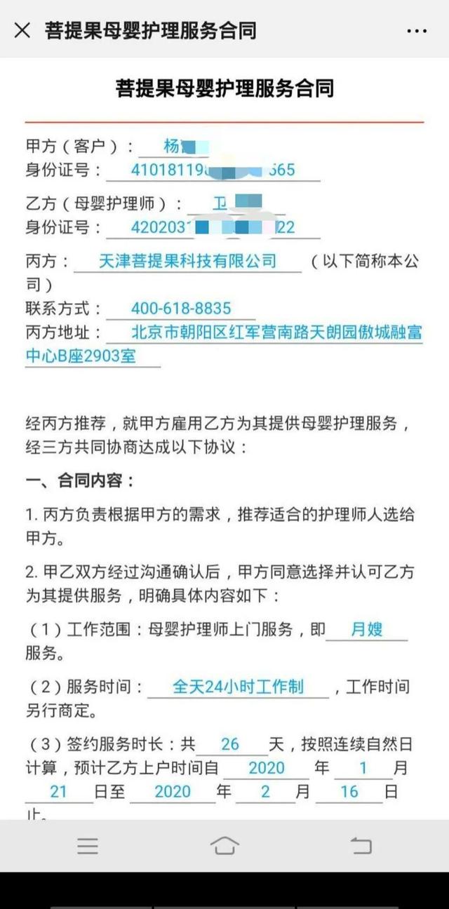 杨女士说,去年 9 月 25 号,她与乙方母婴护理师卫女士、丙方天津菩提果科技有限公司签约,约定服务时长 26 天,费用是 1 万元。