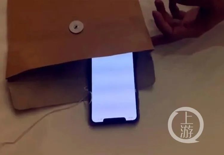 “手机是装在这个牛皮袋里送来的,一开机里面什么都没有,不知道是被谁刷了机,手机里面什么都没有了。”