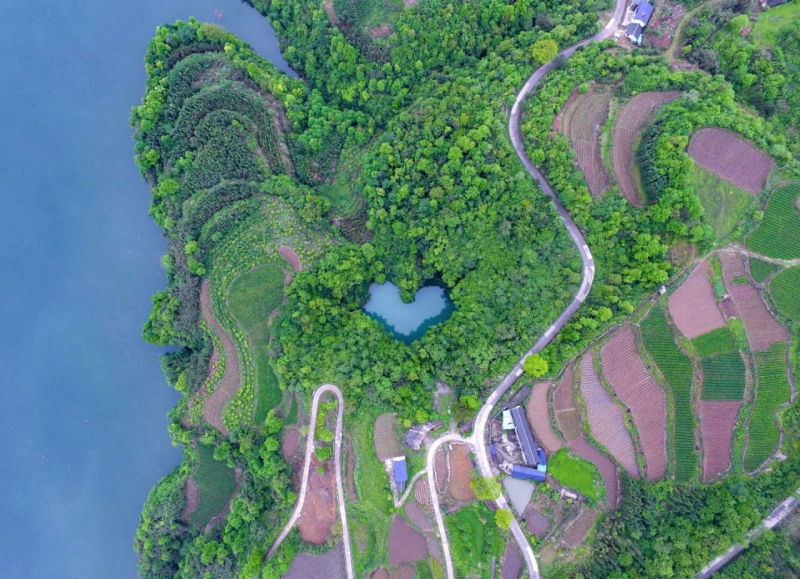 张家界茅岩河景区25日通报称,近日,有摄影爱好者在景区附近航拍时偶然发现一形似心形的蓝色湖泊。景区悬赏6万元为该景观征名。