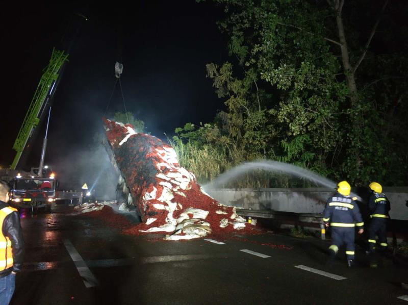 赶赴现场途中,远远能看到事发处升腾起一股浓烟。到达现场时发现,一辆车长约17米的大型挂车已处于猛烈燃烧阶段,整个车身被大火吞噬,燃起的火苗有近五六米高,干辣椒散落一地,空气中弥漫着一股刺鼻的辣椒味。