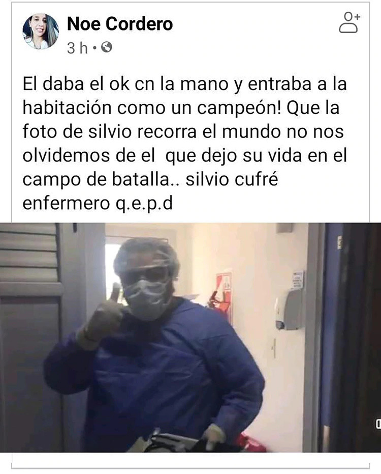 据En24新闻网2020年4月22日报道,阿根廷一名47岁男护士库弗雷(Silvio Cufré)于4月18日感染新冠肺炎不幸离世。他的遗孀奥利瓦(Maria Jose Oliva)不但要面对丧亲之痛,还要面对邻居的指责与威胁。邻居声称他们一家散播病毒,恐吓要放火烧掉房子,威胁他们离开。