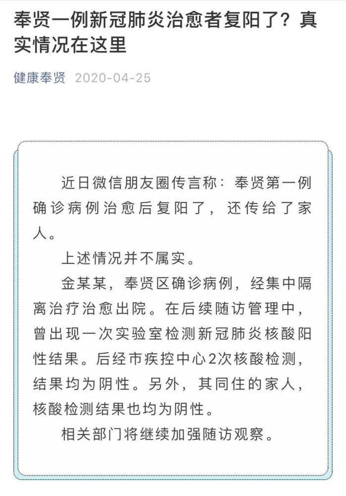 奉贤第一例确诊病例治愈后复阳了