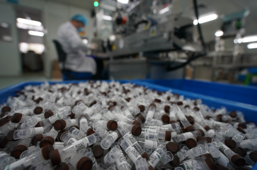 在江苏康为世纪生物科技有限公司,员工在生产病毒样本保存液产品(4月16日摄)。新华社记者季春鹏摄
