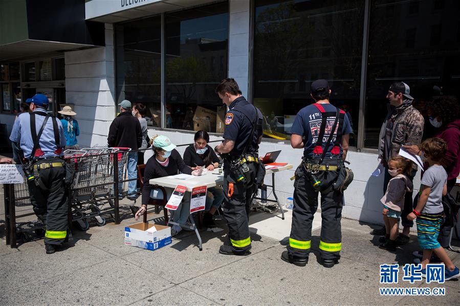 4月25日,消防员在美国纽约布鲁克林区一处新冠抗体检测点外登记,准备接受检测。 新华社发(郭克摄)