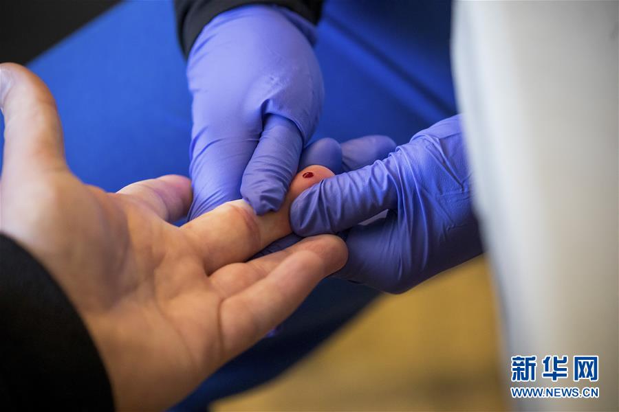 4月25日,在美国纽约布鲁克林区一家超市内的新冠抗体检测点,工作人员采集被测者血样。 新华社发(郭克摄)