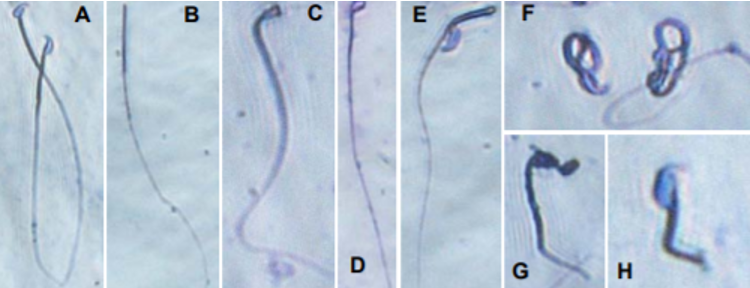 A 对照组的正常精子;B-H组 为药物组出现的异常精子,包括无头、小头、头部畸形、体部畸形、尾部畸形、整体畸形