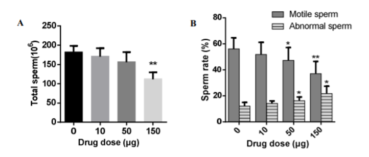 50 μg/只小鼠组的附睾管中精子浓度略有降低,但总浓度仍高;