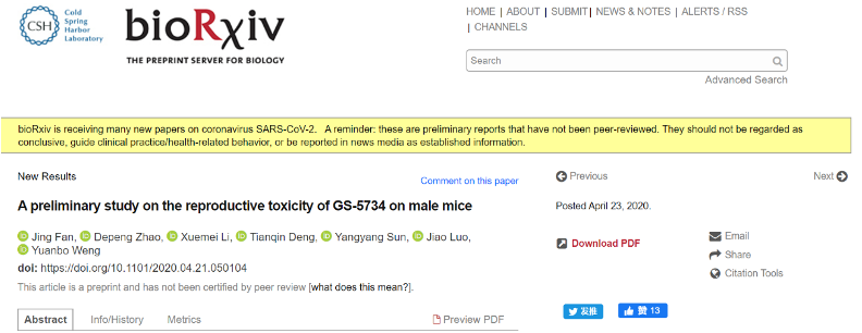 机器之心4月26日消息,深圳妇幼保健院生殖医学中心主任李雪梅等在预印本网站bioRxiv上传了一篇尚未经同行评议的论文,题为《GS-5734对雄性小鼠生殖毒性的一项初步研究》(A preliminary study on the reproductive toxicity of GS-5734 on male mice),GS-5734即尚未正式获批上市的瑞德西韦的研发代号。