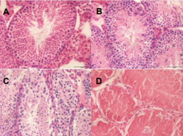 实验组小鼠睾丸染色切片:A为10 μg组、B为50 μg组、CD为150μg组