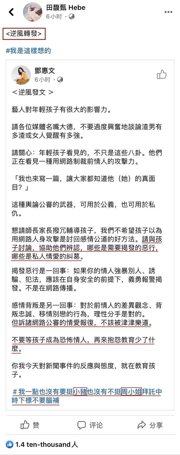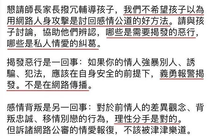 å¥¹è®¤ä¸ºï¼Œæ¶‰åŠæ„Ÿæƒ…问题就ä¸åº”该在网络上å‘è¡¨ï¼Œç†æ€§åˆ†æ‰‹å³å¯ï¼Œå¹¶æŒ‡è´£ä¸€ä¸ªå—害者å‘声å‰è¦è€ƒè™‘å¹´è½»äººè§‚çœ‹åæ„Ÿå—到的网络攻击力: