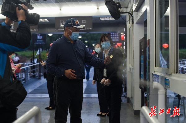游客上游船前要进行扫码,测体温,消毒才能登船。