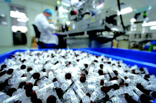 在江苏康为世纪生物科技有限公司,员工在生产病毒样本保存液产品(4月16日摄)。新华社发