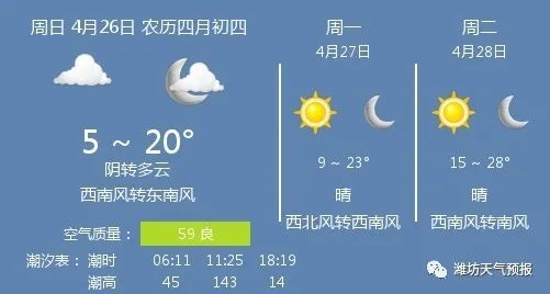 早上好,今天是4月26日,星期日,农历四月初四。潍坊天气:阴转多云,温度 5 ~ 20℃,西南风3-4级转东南风3级。