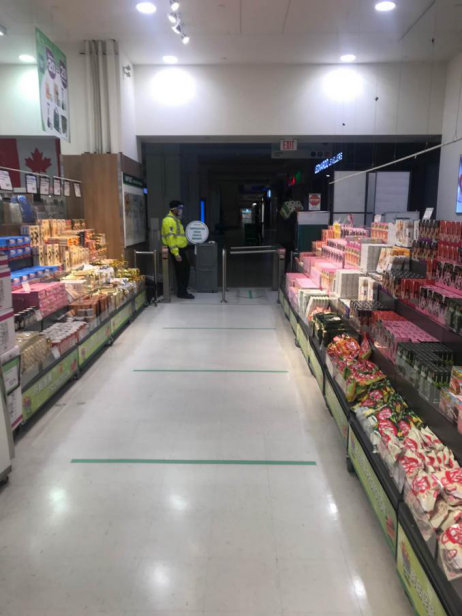 4月24日,温哥华一家华人超市内货物已供应充足,超市门口也有工作人员测温(受访者供图)