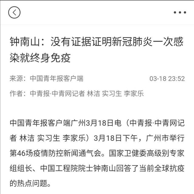 钟南山表示,不能靠集体免疫来防控疫情,没有证据可以证明“一次感染就终身免疫”,下一步最重要是生产出有效的疫苗。↓↓↓