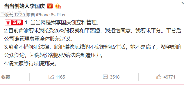 今天中午,李国庆再次登场,微博表示“要求平分当当股权”。