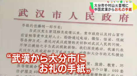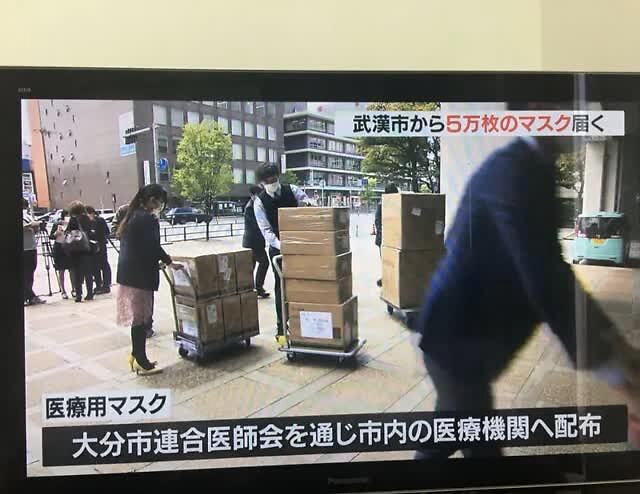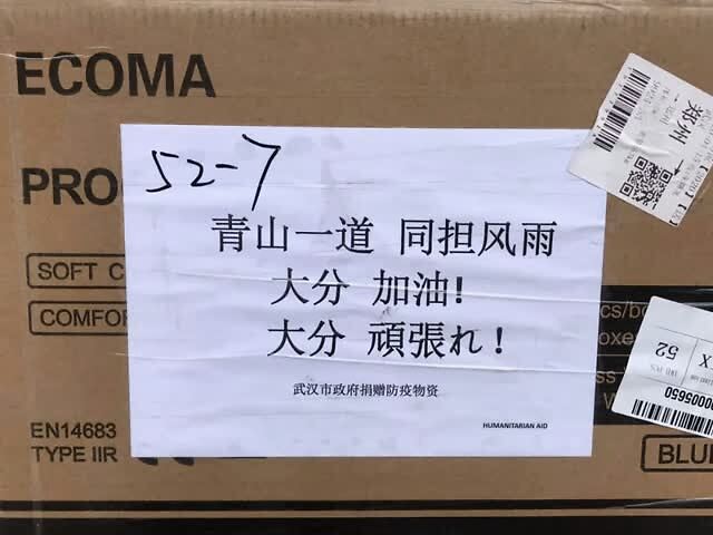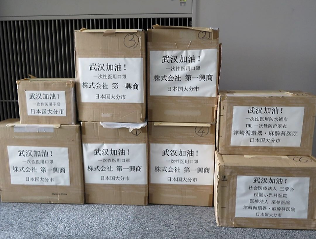 随着中国国内疫情好转,中国不少地方都回赠日本口罩等医疗物资,以感谢当初对方的帮助。据报道,这一次武汉市向大分市回赠了5.3万只口罩。装有口罩的箱子上贴着“大分加油”“青山一道、同担风雨”等寄语。