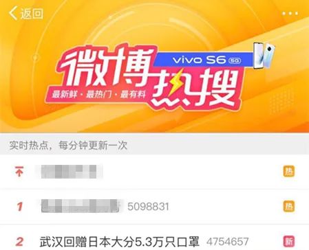 “武汉回赠日本大分市5.3万只口罩”登上微博热搜第二