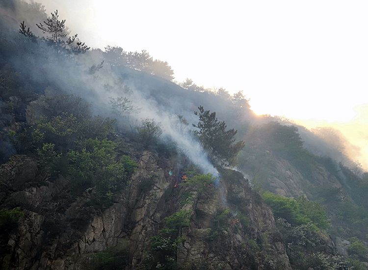 4月26日下午,小珠山岩石陡峭、地势险要,扑救人员向着火点攀爬。