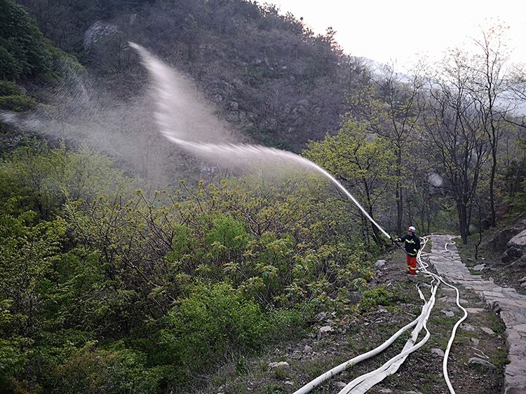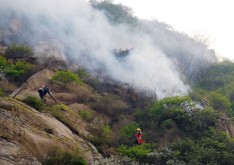 新京报讯 4月26日下午,青岛小珠山景区内的灭火工作依然在持续。零星的着火点散布在陡峭的山坡上,给灭火工作带来不小困难,扑救人员使用风力灭火机和高压水枪控制火情。