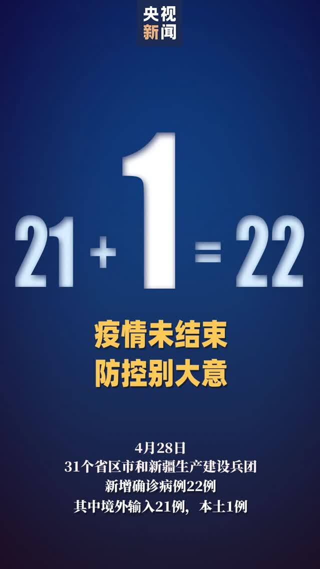 据国家卫健委,4月28日0—24时,31个省(自治区、直辖市)和新疆生产建设兵团报告新增确诊病例22例,其中21例为境外输入病例,1例为本土病例(广东1例);无新增死亡病例;新增疑似病例2例,为境外输入疑似病例(内蒙古1例,上海1例)。