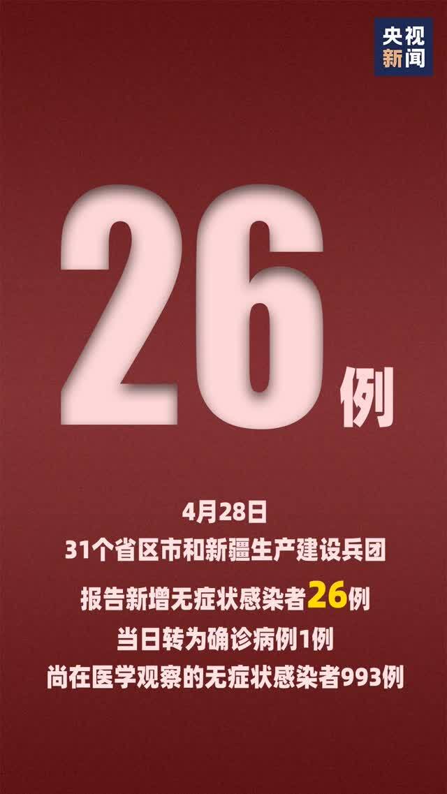 31个省(自治区、直辖市)和新疆生产建设兵团报告新增无症状感染者26例,其中境外输入无症状感染者5例;当日转为确诊病例1例(无境外输入);当日解除医学观察29例(境外输入4例);尚在医学观察无症状感染者993例(境外输入131例)。