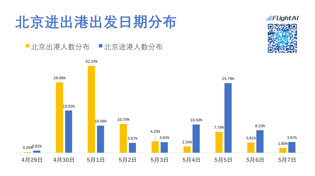实时预订数据总体来看,北京入港人数多于出港人数。从出发日期来看,北京出港人数的分布较集中在五一前期,进港人数节前节后均比较高,节后入港部分应该为返程人员。