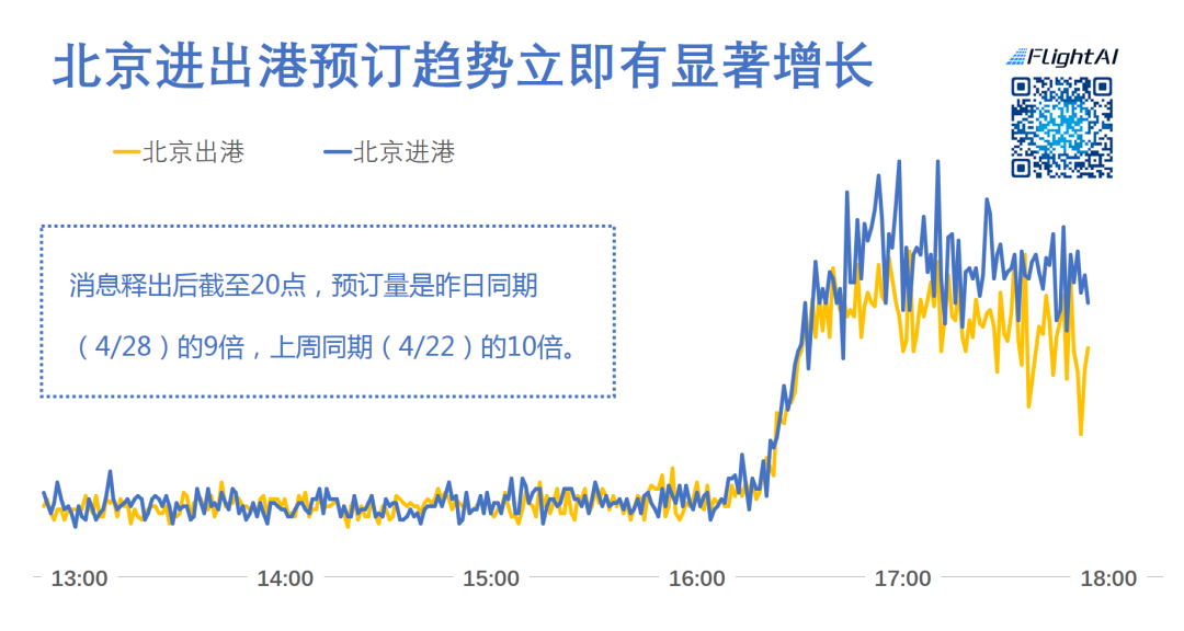 根据携程实时预订数据,4点半左右开始,北京进出港的预订量开始大幅增长。截至18点数据,北京进出港的实时预订量为昨日(4/28)同时段数据的9倍,是上周同期(4/22)同时段的10倍。
