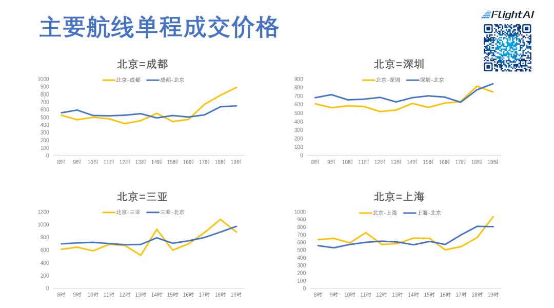 具体到航线,进出港的需求有所不同,价格水平的变化也略有差异。北京-成都,北京-上海航线,出港价格增长较为明显,深圳-北京,三亚-北京等航线,入港价格相对增长更明显一些。