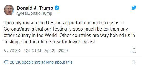 据中新网消息,当地时间29日,特朗普在社交媒体上发文称,“美国报告了100万例新冠病毒感染病例的唯一原因是,我们的病毒检测做得比世界上任何其他国家都好得多。其他国家在检测方面远远落后于我们,因此出现的病例要少得多!”
