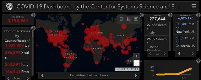 据美国约翰斯霍普金斯大学的新冠疫情最新统计数据显示,截至北京时间4月30日12时左右,全球新冠肺炎累计确诊人数达到3193961例,累计死亡人数达到227644例。