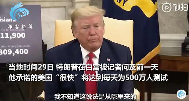 据海外网消息,当地时间29日,特朗普在白宫被记者问及前一天他承诺的美国“很快”将达到每天为500万人测试新冠病毒,不料特朗普一口否定称“我不知道这说法从哪来的”。随后美媒放出视频打脸特朗普。