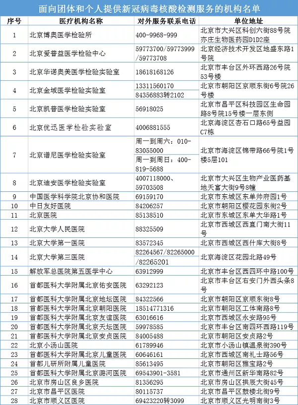 目前,北京市核酸检测机构已由二月初的17所增至50所,可适应当前检测需求。北京市卫健委已在官方网站和官方微信健康北京上公布北京市第一批面向团体和个人提供新冠病毒核酸检测的46家机构名单。
